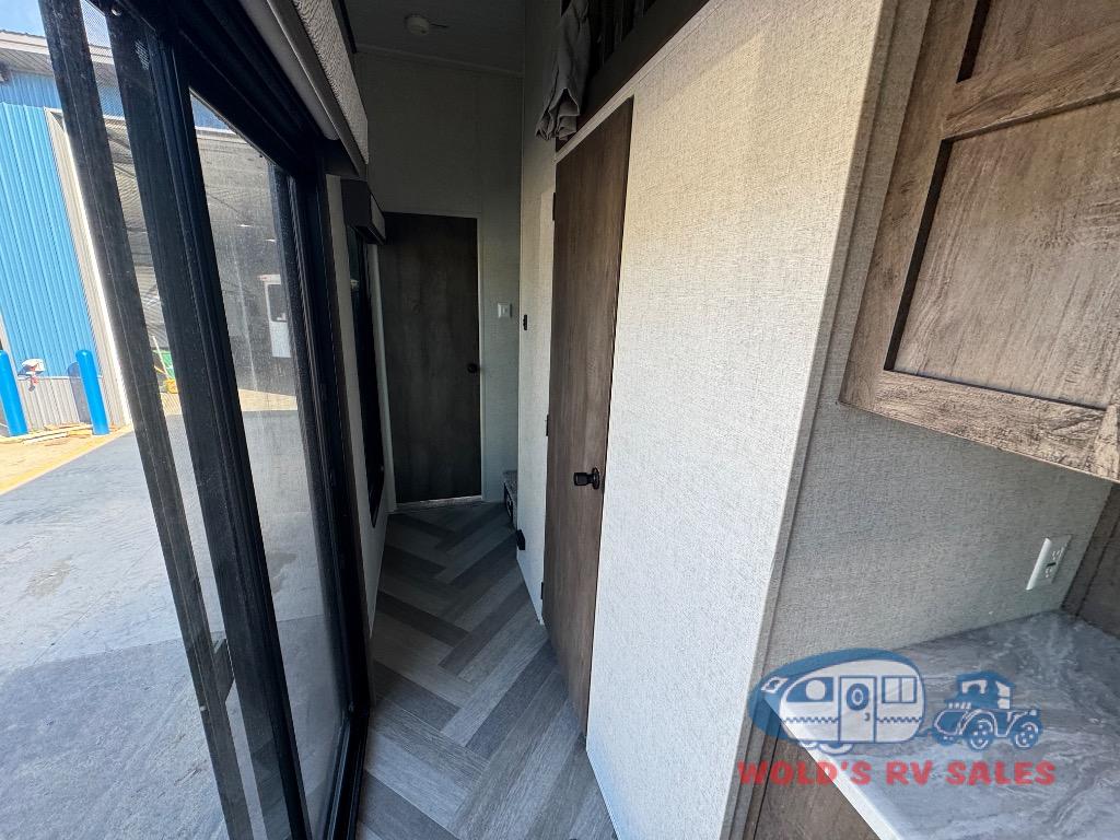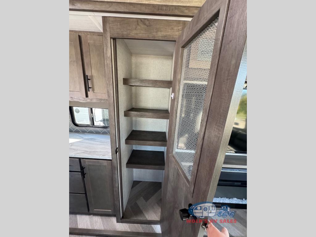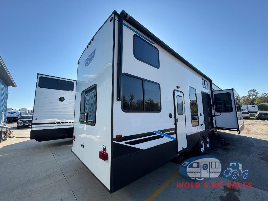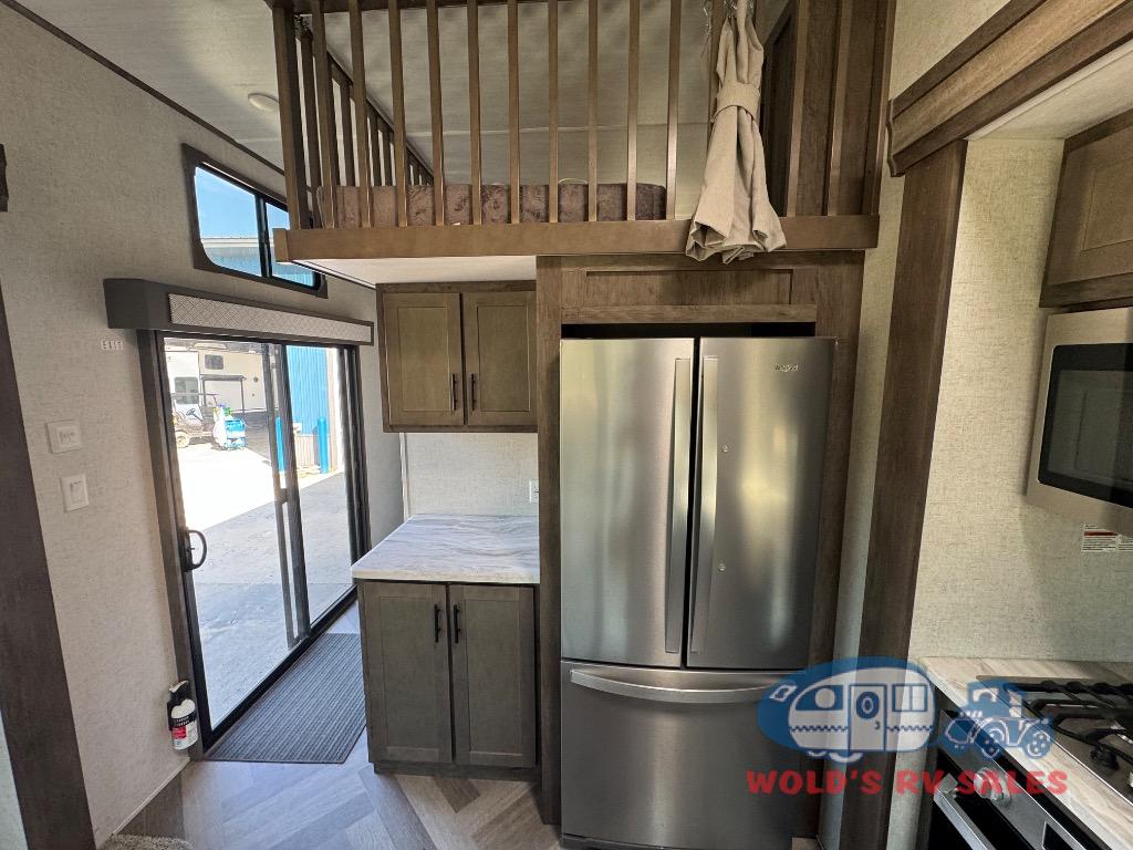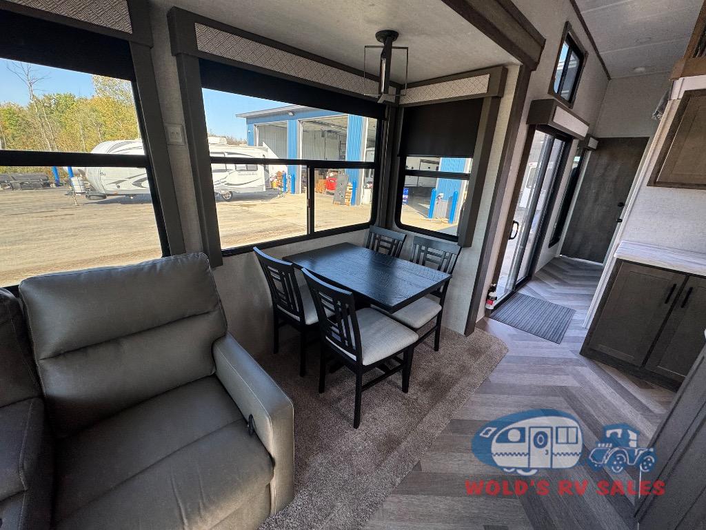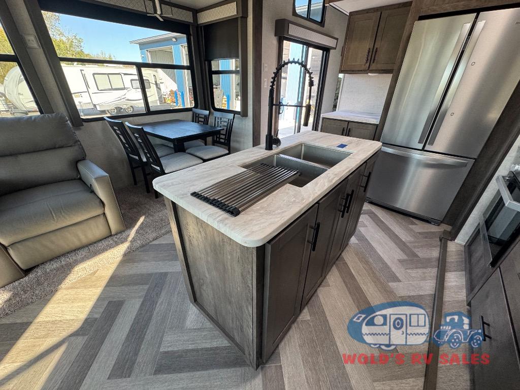 The grandkids will be begging to come along with you on your next getaway in this destination trailer! It features a double loft with three 42" x 74" bunk mats in total above the rear private bedroom. Inside the bedroom is a custom king bed slide with overhead cabinets, large dresser drawers, and a closet that is prepped to add an optional washer and dryer so you won't have to worry about dirty clothes. The 50" walk-in shower with a seat will make it easy for everyone to get squeaky clean each morning too. The living and kitchen area feature a kitchen island, a free standing dinette to enjoy meals and card games, a front sofa, and theater seating across from the entertainment center with a 30" built-in electric fireplace heater for those crisp evenings!