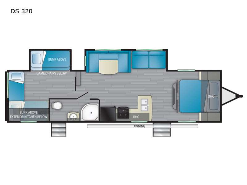 Pack your bags and hitch up this travel trailer for a fun weekend getaway with the whole family! You won't believe all of the space and sleeping spots in the rear private bunkhouse. There is not only a bunk bed above a set of gaming chairs that can convert into a bed, but also a second and third bunk with wardrobe storage underneath one. One of the dual entry doors leads directly into the full bathroom which has a radius shower for everyone to freshen up each morning. Grab some eggs and bacon from the 8 cu. ft. refrigerator then fry them up on the three burner cooktop and enjoy them at the U-shaped dinette. If you need to take a quick afternoon nap then head to either the sofa or the queen bed inside the front private bedroom!