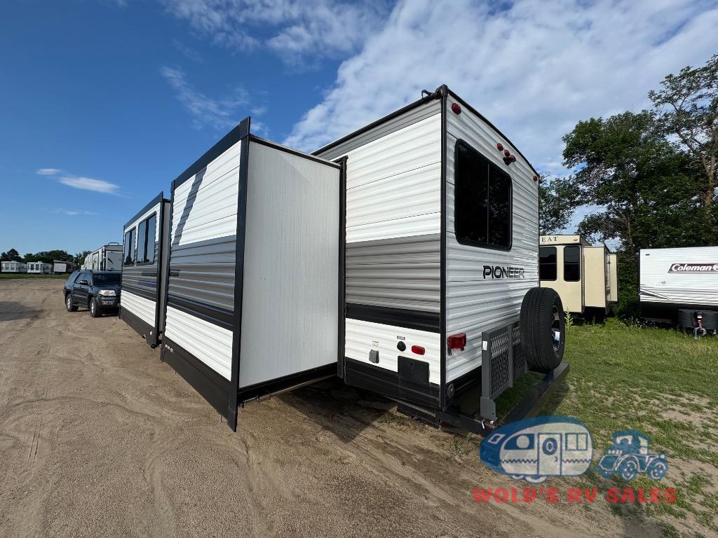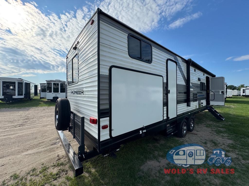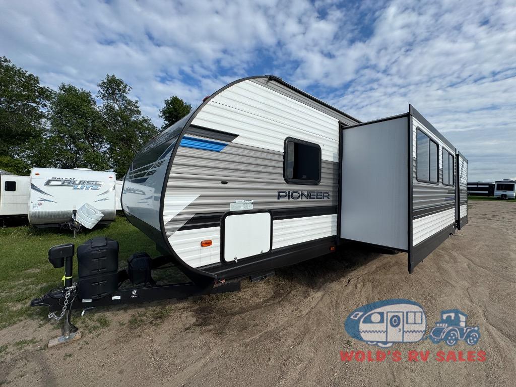 Each one of these Heartland Pioneer travel trailer and toy haulers will lead the way to a comfortable camping trip! The fresh modern décor and carpet free interior creates a comfortable atmosphere. The hybrid aluminum front profile features an aerodynamic radius front cage structure for better wind and water deflection, as well as adds strength. An EZ Camp package comes with black tank flush, an outside shower with hot and cold water, LP quick connect, outside TV hookup to watch the big game, and a flip down secure step with a XL handle to make it easier entering and exiting. With the Pioneer power pack, you will get power stabilizer jacks, a power tongue jack, and a power awning to socialize underneath rain or shine. Don't leave your bikes, wood, or coolers behind either, simply store them with the flip-down storage rack!
