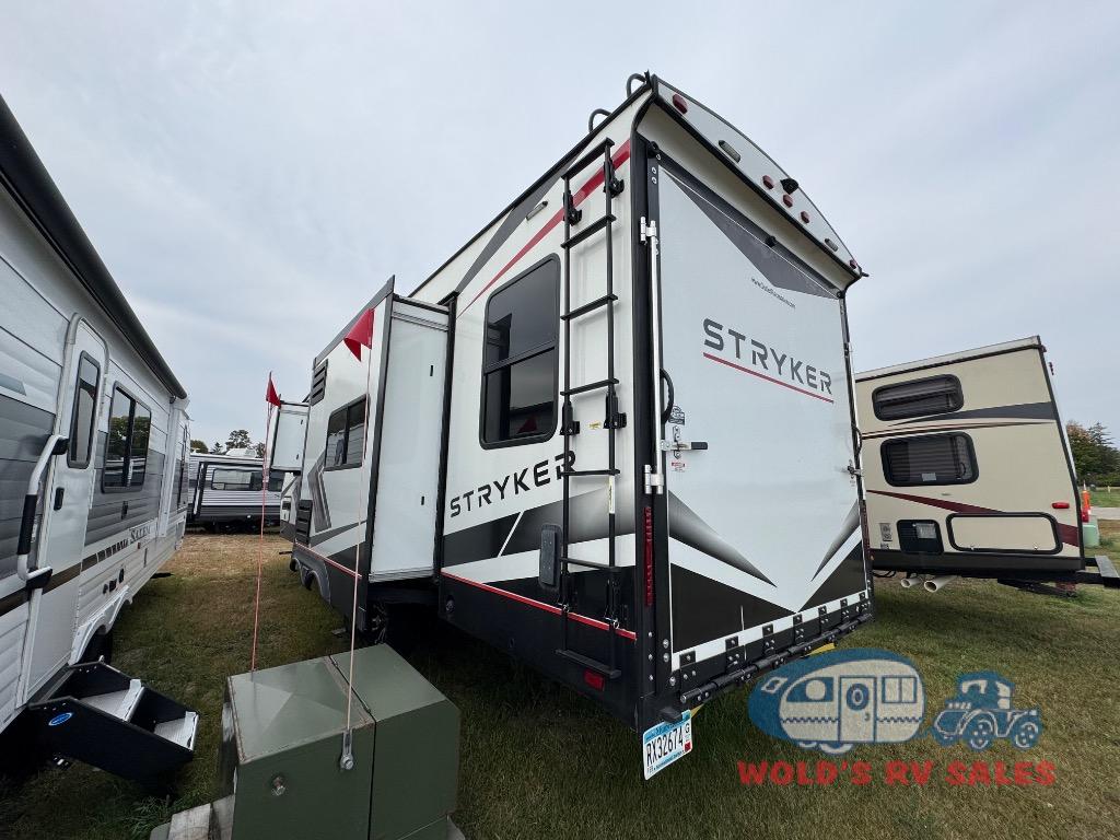 Outdoor enthusiasts have met their match in this Stryker toy hauler! The 16' garage and 5,000 lb. tie-down rings will allow you to bring along your favorite toys, plus there is a 30 gallon fuel station so they're ready when you are. Your guests can make the garage their bedroom at night since there are opposing sofas with a dinette and a power queen bed up above. The front master bedroom includes a king bed, a wardrobe slide, plus two additional wardrobes for tons of storage space. And don't overlook the main living area with a sofa slide out, two lounge chairs, plus a full kitchen to create home cooked meals!