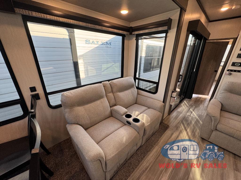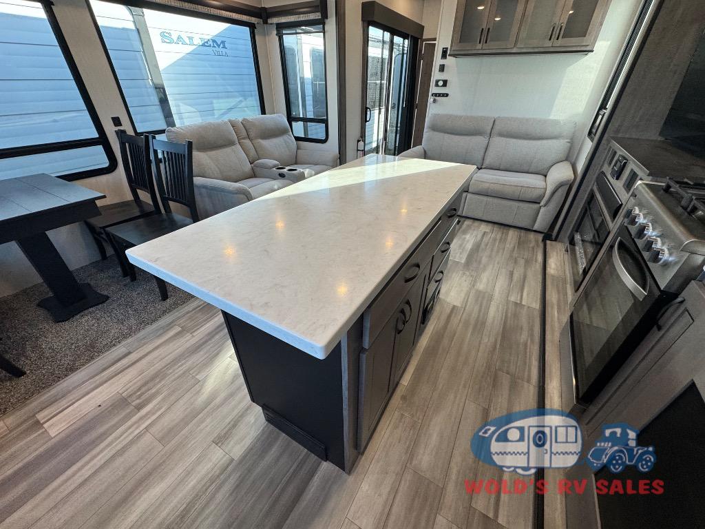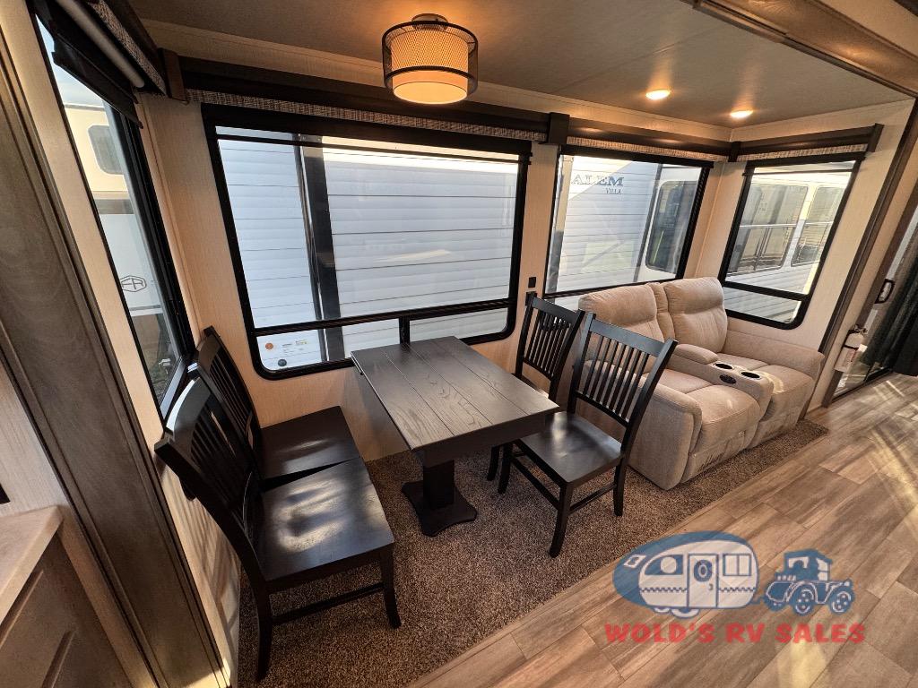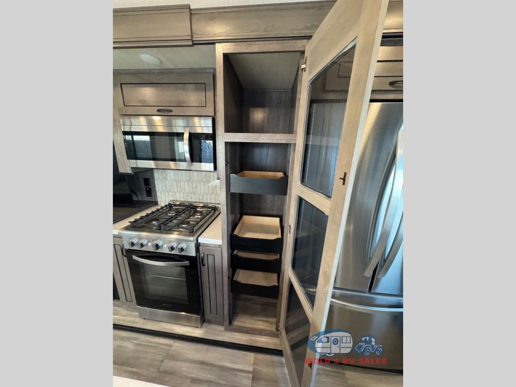 This Cedar Creek Cottage destination trailer is a great fit for the camper who doesn't want to let their cooking game get hindered just because they are on vacation. There is a full-width countertop at the front of this trailer that you can use to prep meals, and you have more prep space with the kitchen island. A 20-cubic foot refrigerator can store many, many ingredients, and the full pantry will keep your dry goods in one place. The power theater seats will provide you with the perfect place to cozy up with a good book and a warm blanket at the end of a long vacation day, and the two entry doors will allow you to enter this trailer easily.