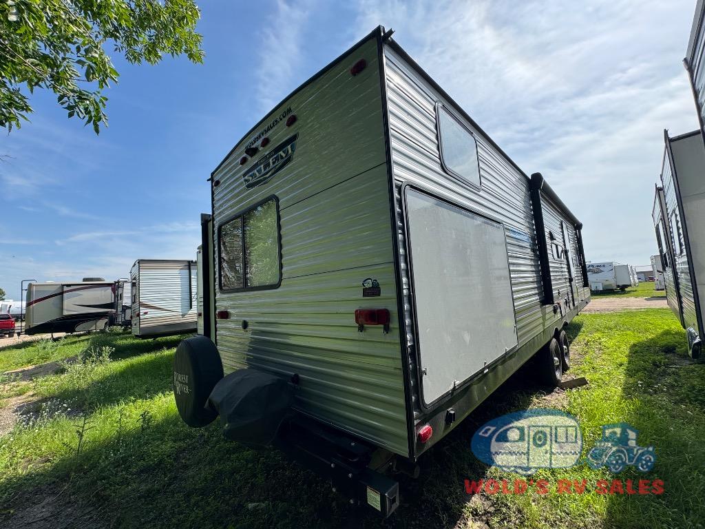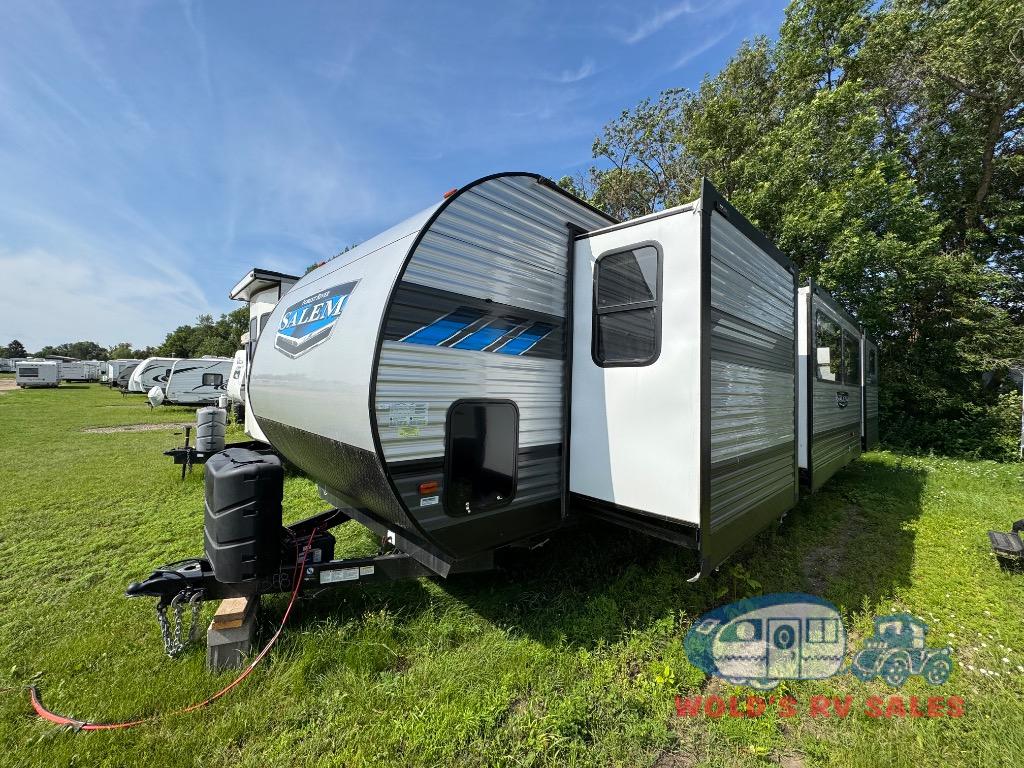 Do you need a break from the mundane camping life? If so, it's time to check out this exciting and full-featured Salem travel trailer! This unit provides two separated sleeping spaces, a rear private bunkhouse and a front private bedroom. Another feature that is just as helpful as the one in your own home is the kitchen. With an 11 cu. ft. frost free refrigerator, a three burner cooktop, a double sink, and abundant cabinet storage, you will be able to create delicious meals for the entire family. Plus, if you prefer to have a sunrise breakfast, you can simply take your preparations outside to the outdoor kitchen!