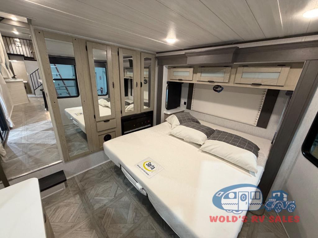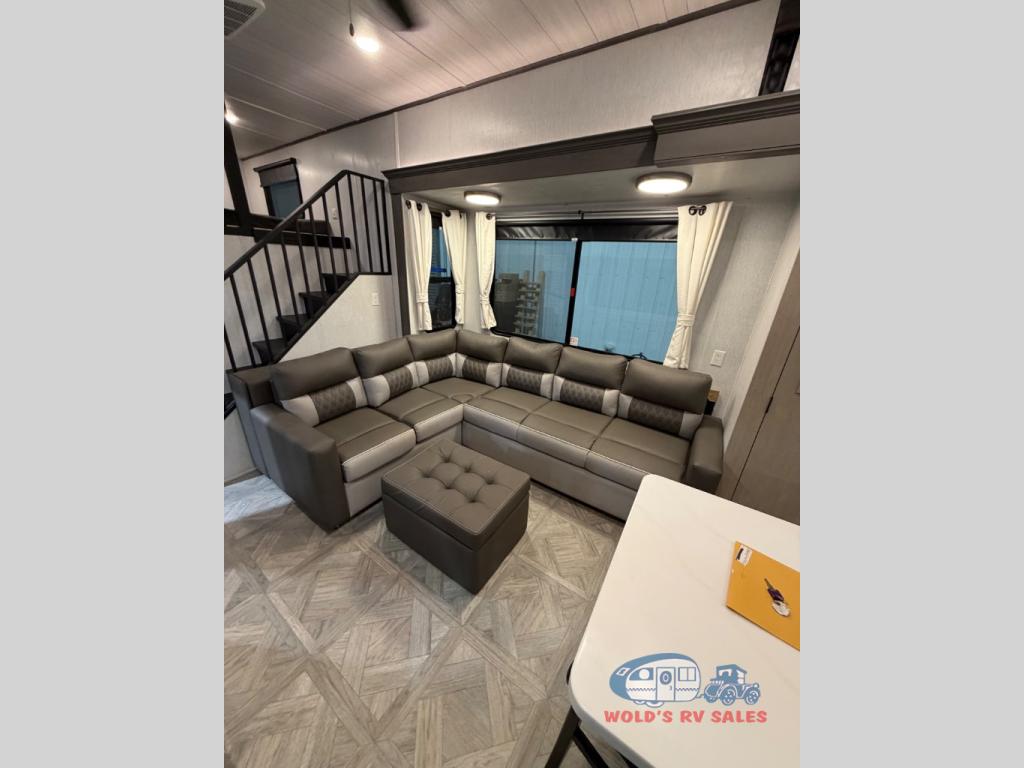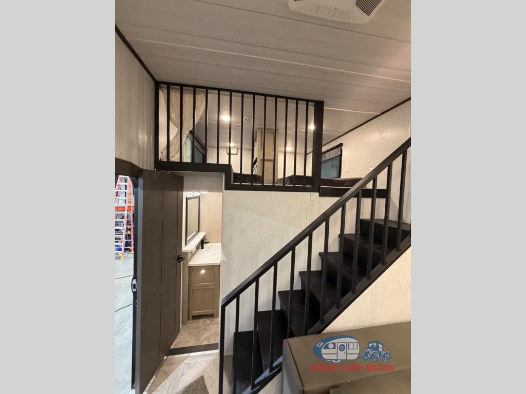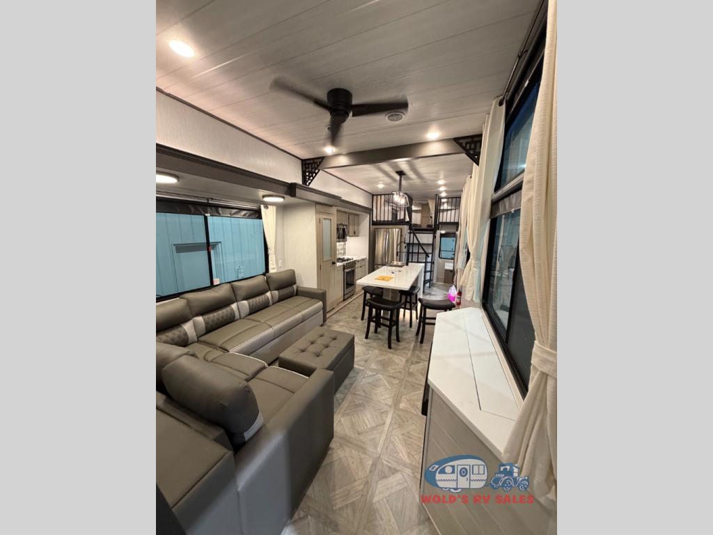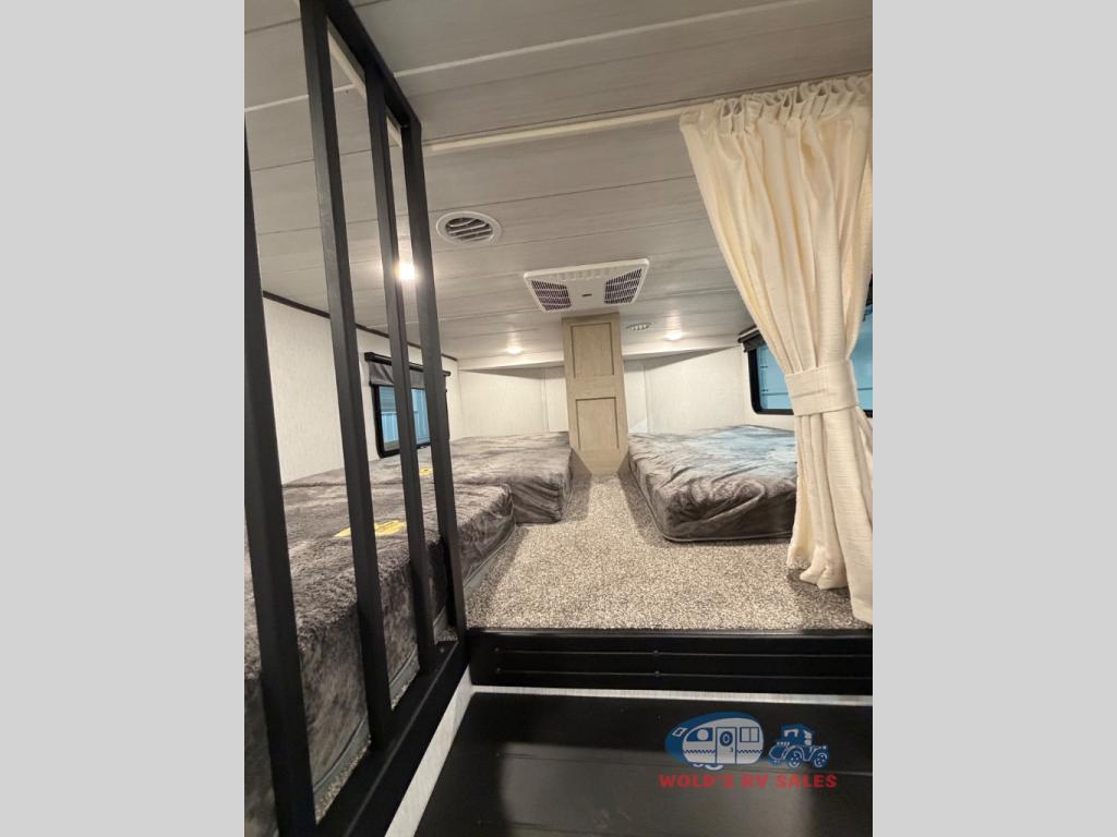 You will feel right at home in this destination trailer! It has not only has one loft in the rear with two 42" x 74" bunk mats, but also a second loft in the front with spiral steps leading up to two bunk mats. The front private bedroom features a king bed slide with versa-tilt to lay your head on at night with front windows to let in lots of natural lighting and sunshine in the morning. Relax in true comfort at night on the L-shaped sectional sofa across from the entertainment center with a fireplace. The kitchen island provides extra space to prepare delicious meals and comes with four bar stools to enjoy your breakfast each morning. Everyone will stay fresh and clean with a walk-in shower in the rear private bedroom, plus there is an area prepped to add an optional washer and dryer. Head outside through either the patio door or the second entry/exit door each day!