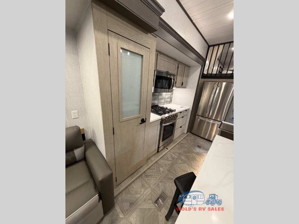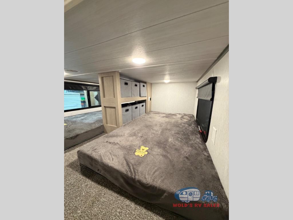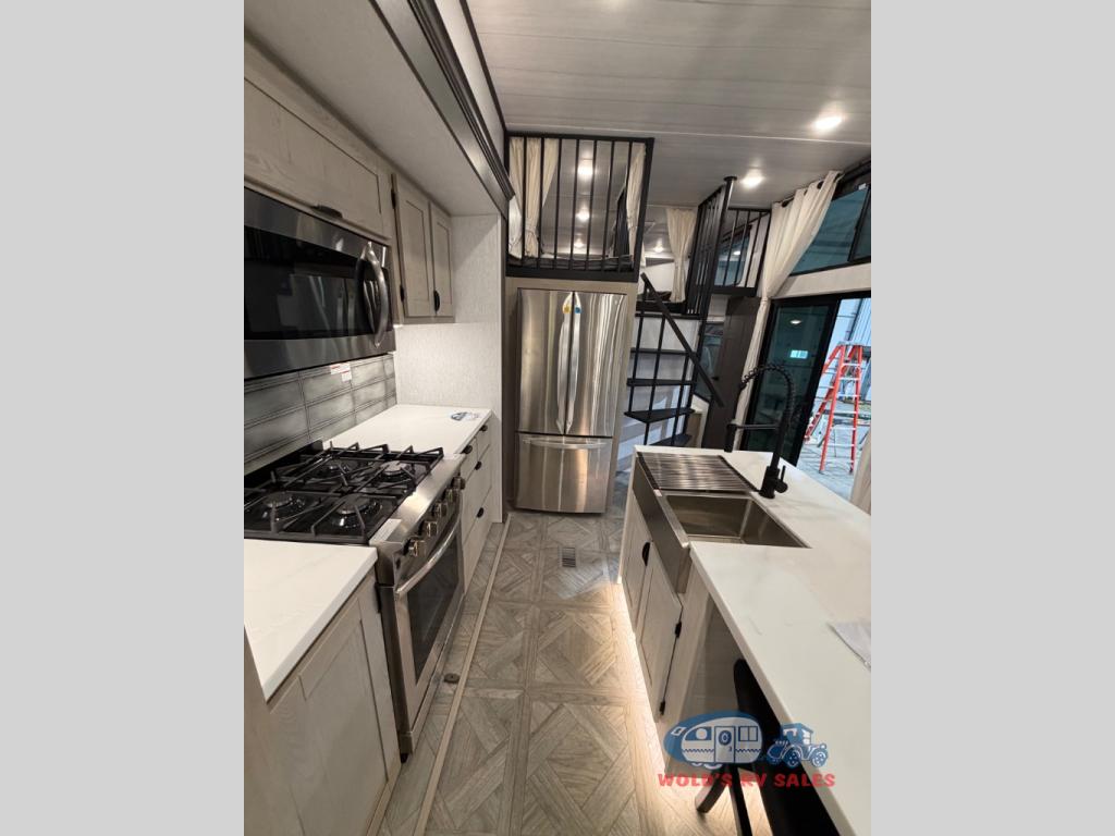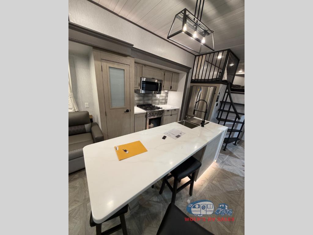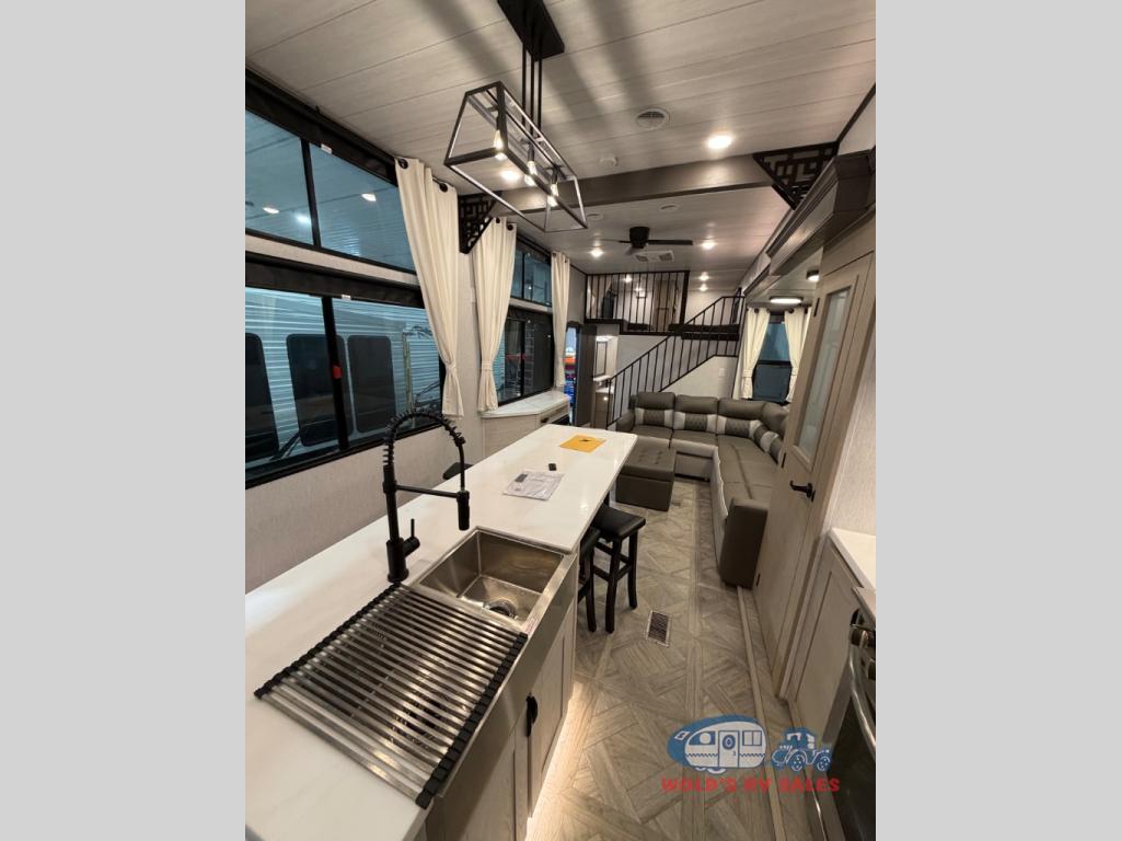 You will feel right at home in this destination trailer! It has not only has one loft in the rear with two 42" x 74" bunk mats, but also a second loft in the front with spiral steps leading up to two bunk mats. The front private bedroom features a king bed slide with versa-tilt to lay your head on at night with front windows to let in lots of natural lighting and sunshine in the morning. Relax in true comfort at night on the L-shaped sectional sofa across from the entertainment center with a fireplace. The kitchen island provides extra space to prepare delicious meals and comes with four bar stools to enjoy your breakfast each morning. Everyone will stay fresh and clean with a walk-in shower in the rear private bedroom, plus there is an area prepped to add an optional washer and dryer. Head outside through either the patio door or the second entry/exit door each day!