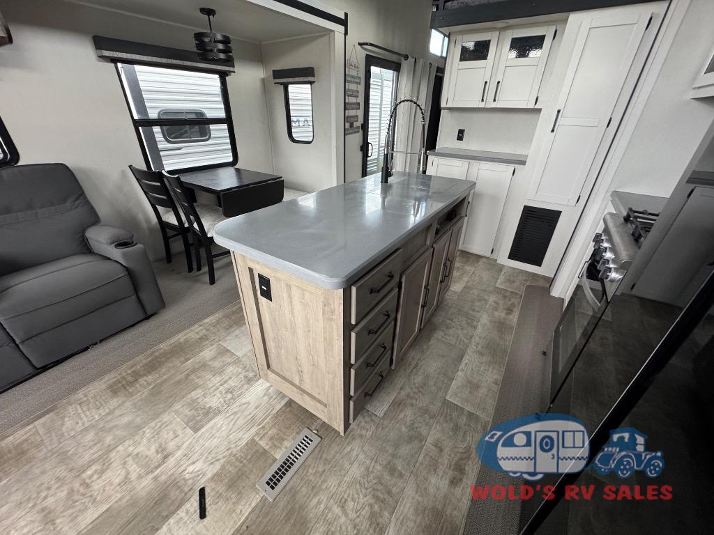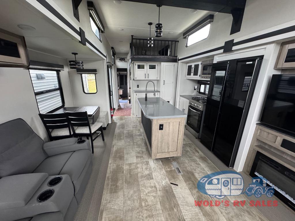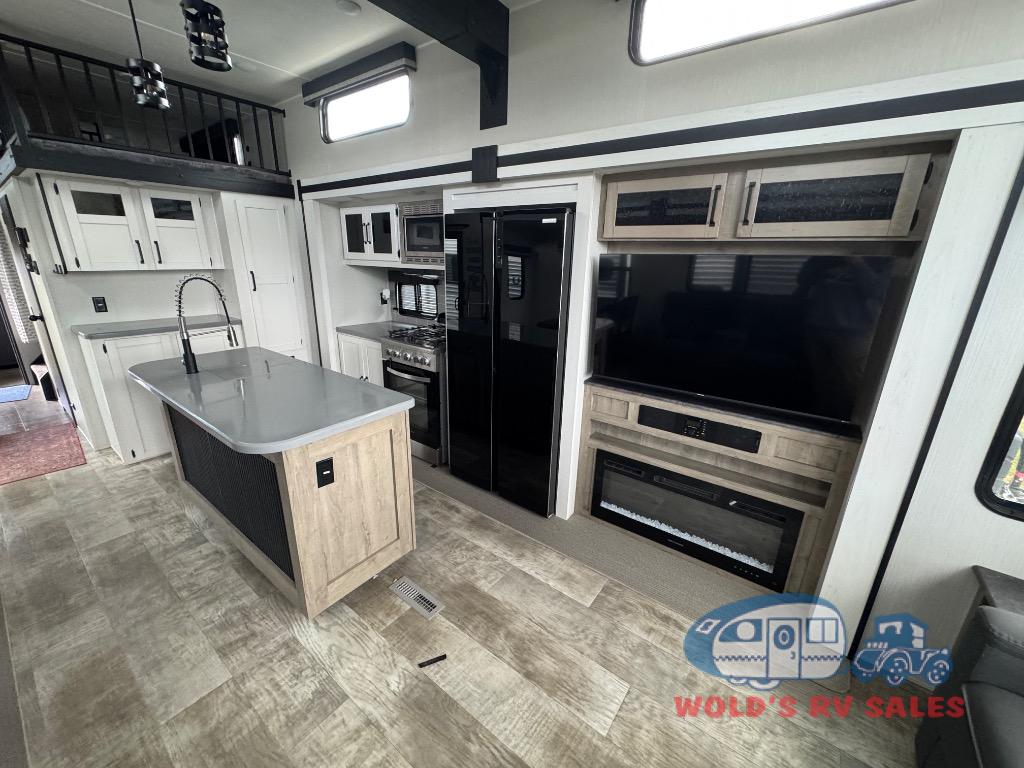 This loft model is the perfect destination trailer for a family of six or more! The upper loft is over the rear bedroom and mid-coach bath featuring two 32" x 69" beds and a 58" x 58" bed over the bath portion with cabinets and a wardrobe/closet for your things. On the lower level in back, a private bedroom with private entry/exit includes a king bed slide, plenty of closet space with one featuring a washer/dryer prep option. The full bath offers a 32" x 40" shower, double linen cabinets, plus a toilet and vanity. In the combined kitchen and living area, the dual opposing slides really open up the space. Here you will find a kitchen island with a large sink, a free standing table with one bench and two chairs, plus two recliners along the curb side slide. Opposite, your kitchen appliances and entertainment center with a residential style refrigerator for your perishables. The very front of the unit features a sofa, and there are plenty of storage spaces between overhead cabinets, pantry/linen and wardrobe storage, plus outside compartments for your things as well.